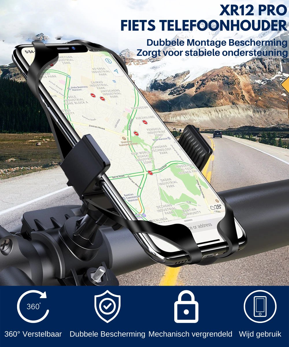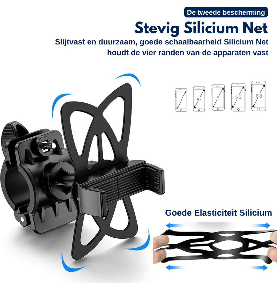 Met behulp van twee contactpunten, zal de telefoonhouder uw apparaat stevig op uw stuur monteren met een premium harde plastic handgreep met een siliconen net, waarmee elke hoek van uw apparaat strak op de houder wordt bevestigd!