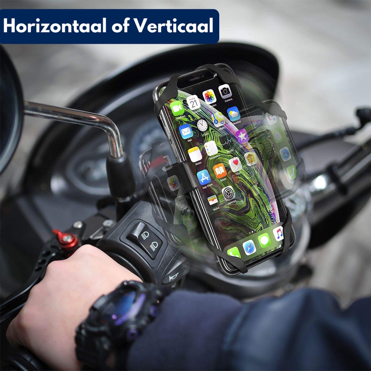 Gemaakt van stevige en elastische siliconen banden, de telefoonhouder kan flexibel worden uitgerekt om te passen op alle 4,0 "-6,8" -telefoons, geschikt voor iPhone, Samsung Galaxy, Google Pixel, HTC, LG, en andere Android-smartphones en GPS-apparaat.
